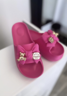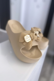 KLAPKI DAMSKIE NA GRUBEJ PODESZWIE Z KOKARDĄ I MISIEM BEŻOWE
